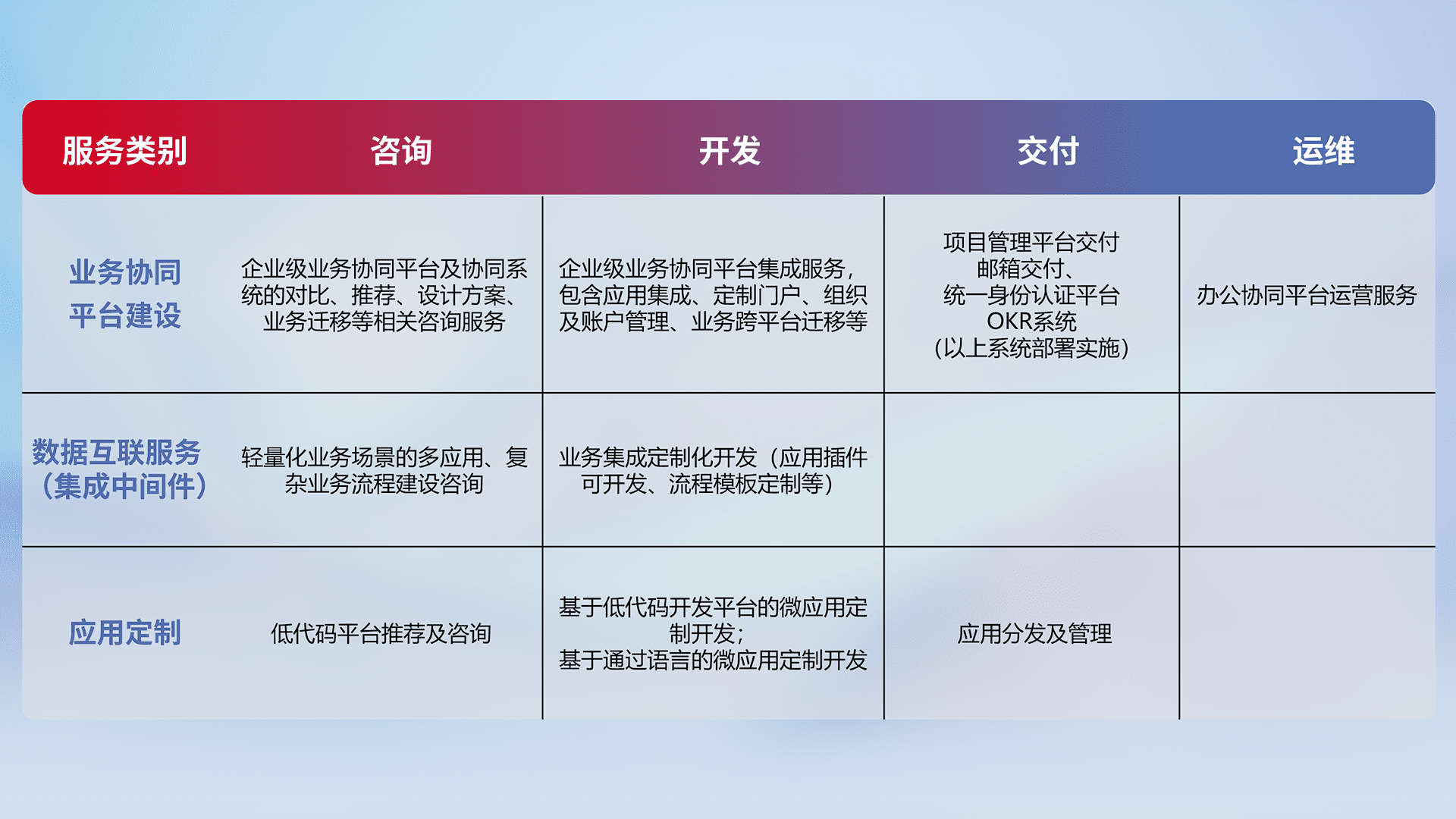 针对钉钉、、、、企微、、IDaas等平台级产品提供产品的规划、、、、方案、、交付、、、、定制化开发等服务,,实现如统一协同办公、、、、智能客户服务、、混合会议管理、、、智能数据查询、、等业务场景,,,实现数字化转型。。。。