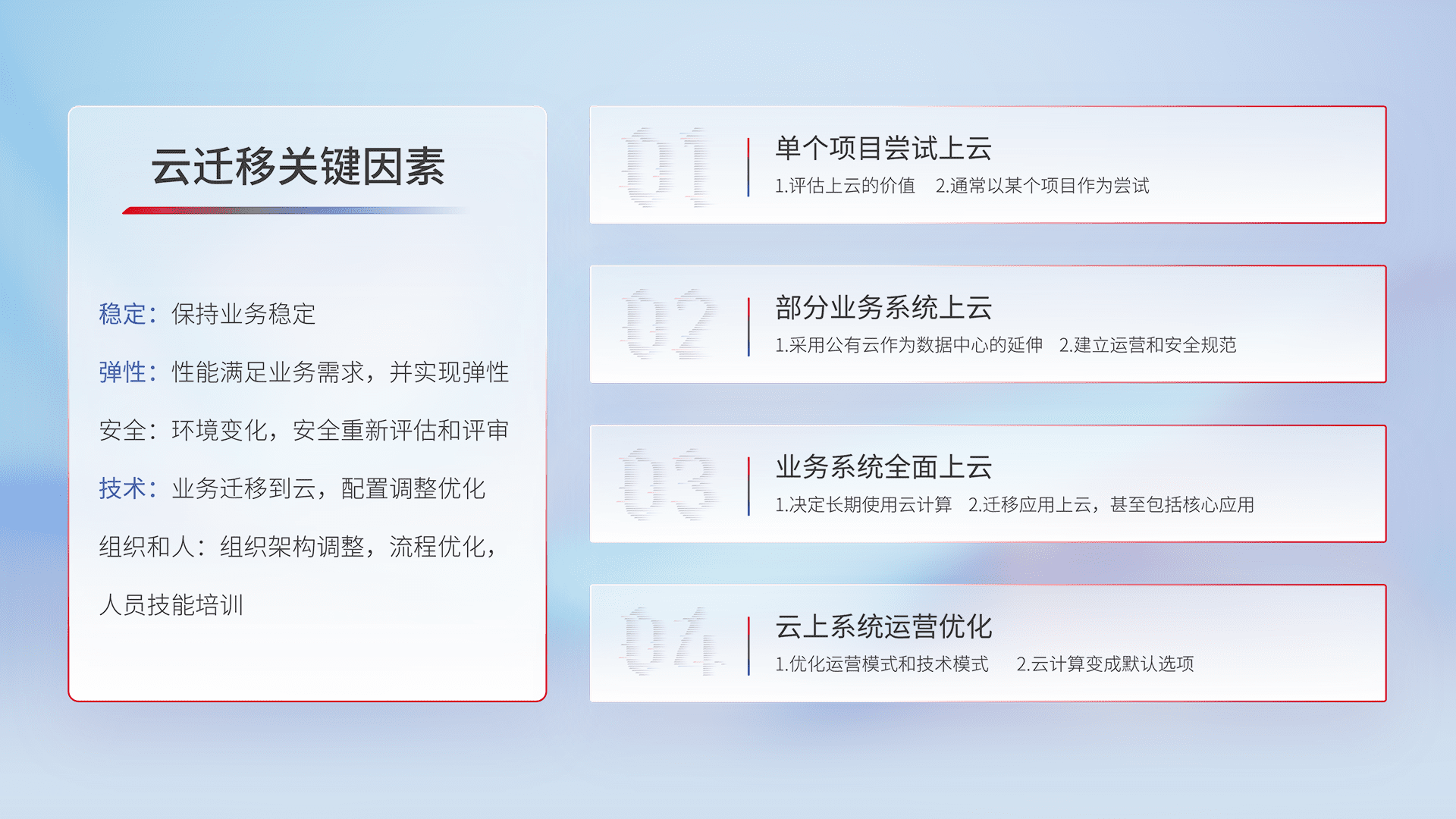 结合实际业务,,从规划设计、、、、云平台选型、、、、云原生改造、、数据迁移、、集成交付,,,迁移全过程为客户识别最佳上云路径,,,,做好风险识别管理,,设计网络架构、、、身份权限、、、安全审计合规、、、、操作审计、、、日志审计、、、、监控告警策略、、、多站点容灾设计等,,,,对云上基础设施进行整体规划,,提升IT治理水平,,,以满足弹性、、高可用、、、、高性能的需求。。