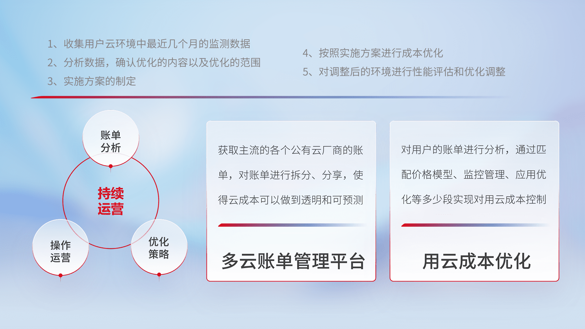 通过多云纳管,,,以统一的资源数据模型把客户的云资源进行抽象和封装,,进而实现对多云资源的统一操作,,,,保障云资源管理的可靠性、、、稳定性与可用性。。。。量身定制化运维内容,,,,配置、、开发运维、、、补丁管理、、、、备份、、、、监控、、、、认证和访问管理、、审计和日常巡检等,,,保障在用云过程中的可靠度,,稳定度以及高可用率。。。